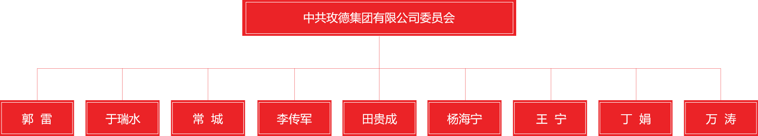 郭雷、于瑞水、常城、李傳軍、田貴成、楊海寧、王寧、丁娟、萬濤九位同志為中共玫德集團有限公司委員會委員。郭雷同志任黨委書記,于瑞水同志任黨委副書記。