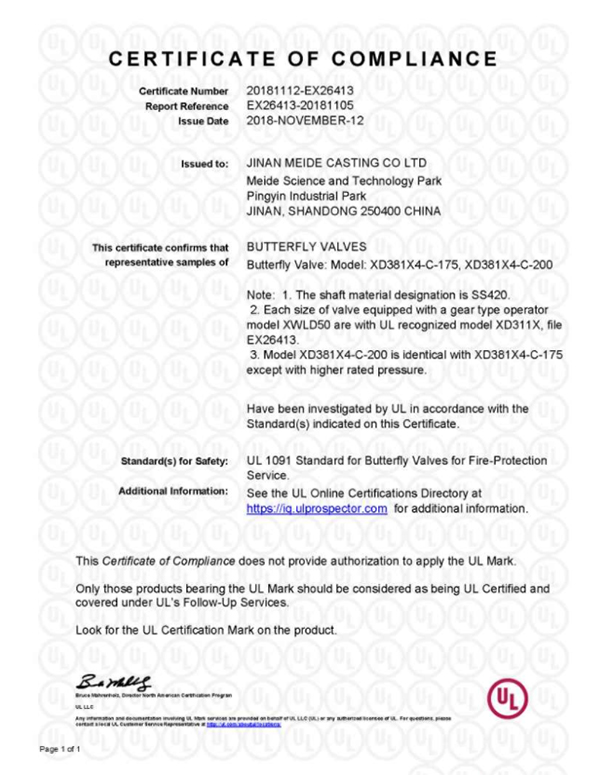 Jinan Meide Casting Co., Ltd. has got UL approval for Butterfly Valve with Tamper Swith (Model XD381X4-C)