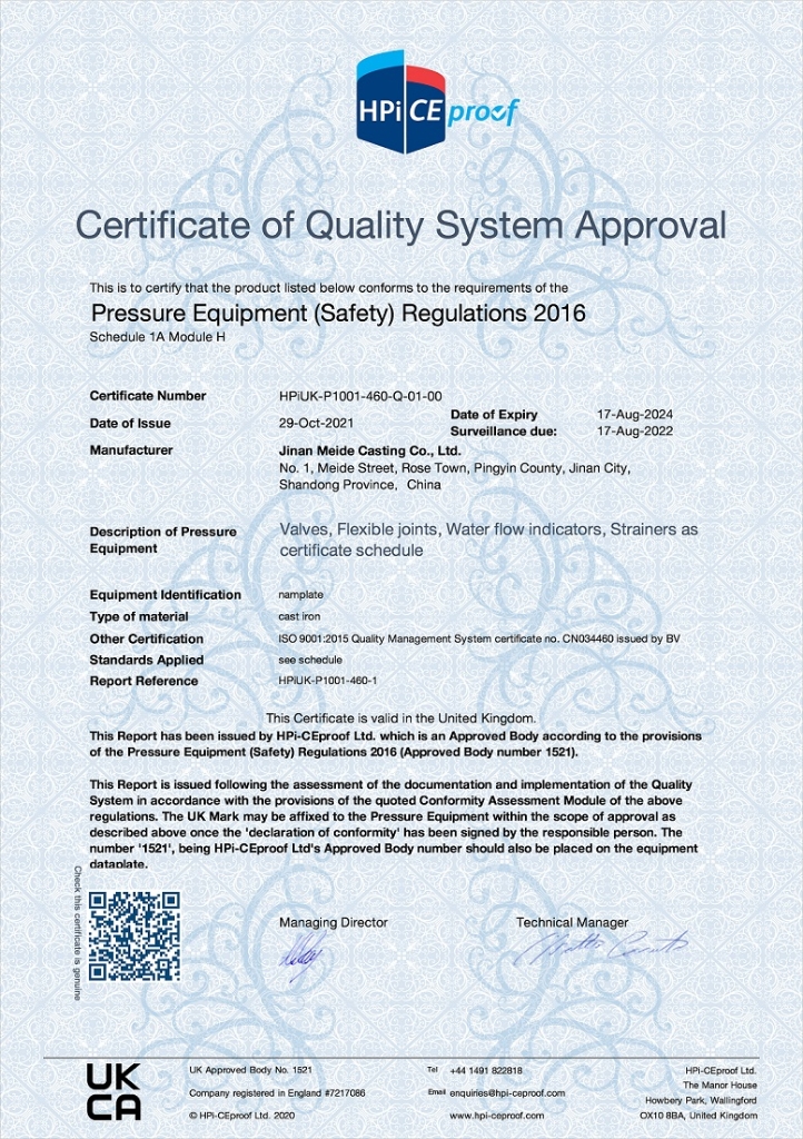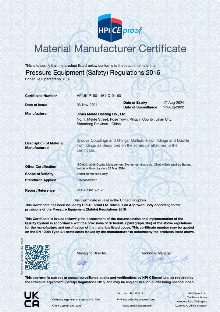 Meide Malleable Iron Pipe Fittings and Ductile Iron Valves have got UKCA Approvals.