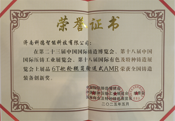 濟(jì)南科德智能科技有限公司的6T舵輪輥筒輸送式AMR摘得“全國(guó)鑄造裝備創(chuàng)新獎(jiǎng)”。