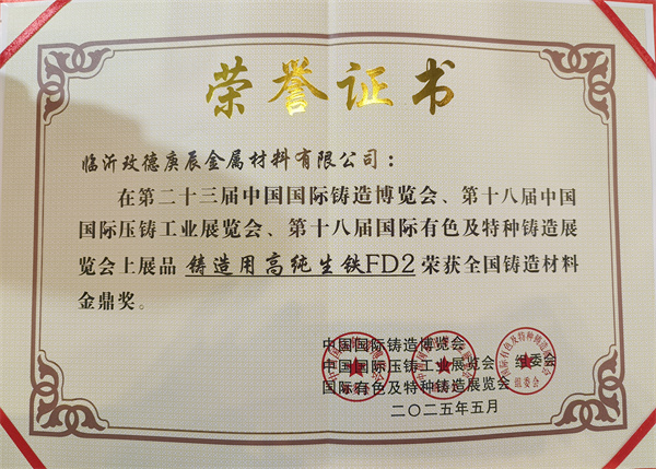 臨沂玫德庚辰金屬材料有限公司的鑄造用高純生鐵FD2榮獲“全國(guó)鑄造材料金鼎獎(jiǎng)”。
