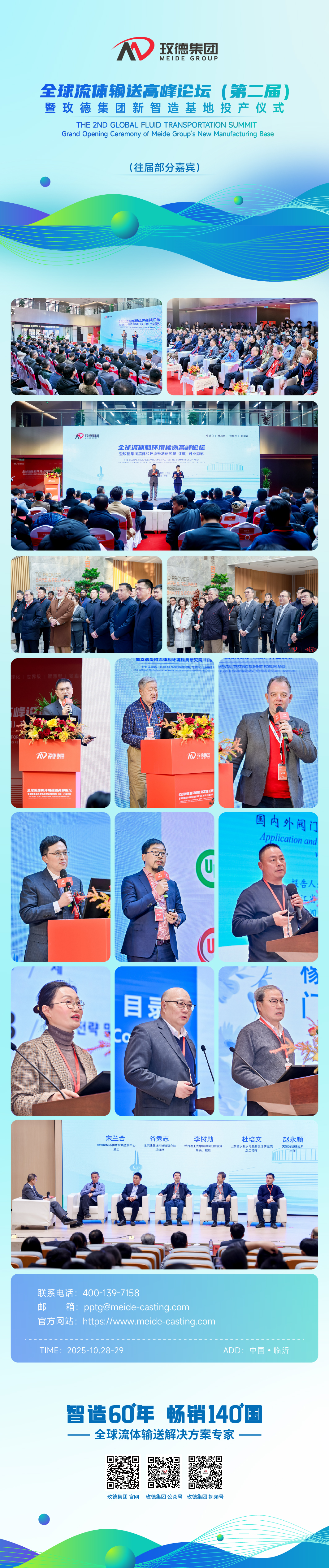 全球流體輸送高峰論壇(第二屆)暨玫德集團(tuán)新智造基地投產(chǎn)儀式將于2025年10月28日至29日在山東臨沂隆重召開!本屆論壇將邀請(qǐng)全球頂尖專家及學(xué)術(shù)骨干等300余人,匯聚行業(yè)智慧,共探前沿技術(shù)。論壇將聚焦市政、建筑、工業(yè)與電力等領(lǐng)域,圍繞行業(yè)政策、發(fā)展動(dòng)態(tài)與未來展望開展深度研討,共同探討行業(yè)發(fā)展的新機(jī)遇與新挑戰(zhàn)。